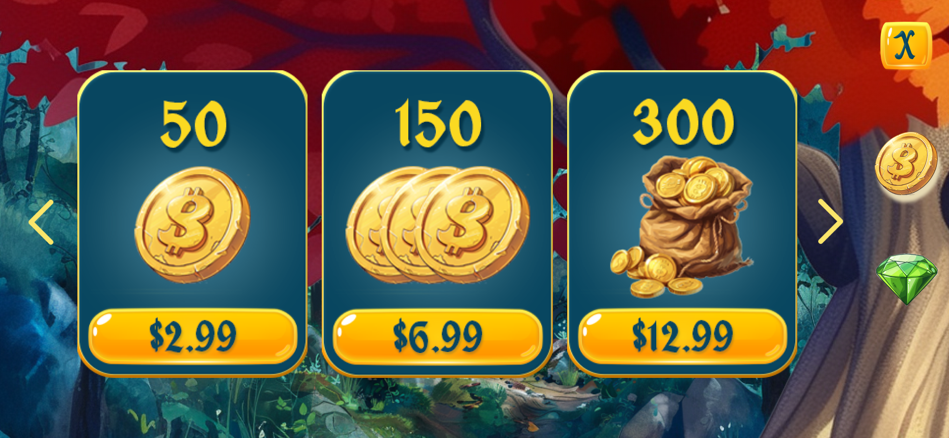 Once I had established the designs for the coins and jewels, I worked on a simple storefront. I pulled in different background elements to help accent the menu items and differentiate the store screens from the pop-ups.